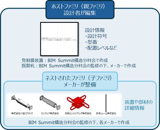 この課題に対して、設計者・メーカーとも利用・整備がしやすいよう、入れ子の構成とした免制震装置および既製杭ファミリを整備しました。設計者が直接編集を行うホストファミリ(親ファミリ)には設計符号や型番といった設計情報を、メーカーが整備するネストされたファミリ(子ファミリ)には装置や部材の詳細な情報が含まれています。