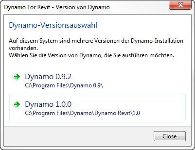 Beachten Sie, dass diese Auswahl nur einmalig in der Revit-Sitzung kommt – schließen Sie Dynamo und rufen es wieder auf, wird dieselbe Version wie anfangs gewählt gestartet, damit Sie diese Auswahl nicht jedes Mal treffen müssen. Bei einem Neustart von Revit erfolgt die Abfrage dagegen erneut.