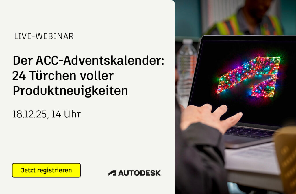 Im BIM on Air Webinar am 18.12., 14:00 CET erwarten Sie 24 Türchen voller ACC-Produktneuigkeiten: Neue Funktionen, optimierte Workflows und praktische Tipps für Ihren digitalen Baualltag.