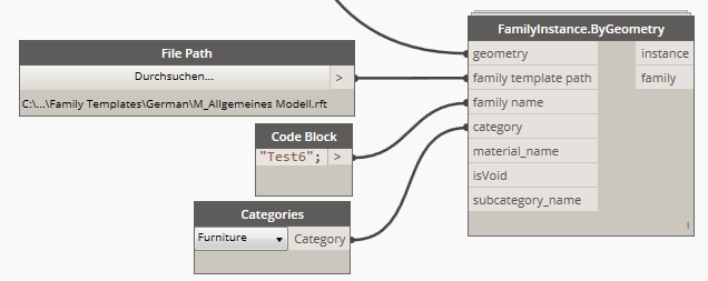 Ebenfalls in dem Paket Spring Nodes finden Sie die Funktion FamilyInstance.ByGeometry, die Ihnen die Erstellung einer Revit-Familie sowie die Wahl einer Familienvorlagendatei, Kategorie und natürlich eines Namens für die Familie ermöglicht. Darüberhinaus können Sie auch ein Material der Familie bzw. einer Unterkategorie der Familie zuweisen, sowie die Familie als Abzugskörper definieren:
