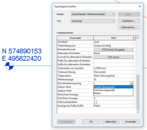 Übrigens – bei der Beschriftung können Sie immer wählen, ob sich diese auf denVermessungspunkt (entspricht z.B. den Gauss-Krüger Koordinaten) oder den Projektbasispunkt (lokale Referenz) beziehen soll: