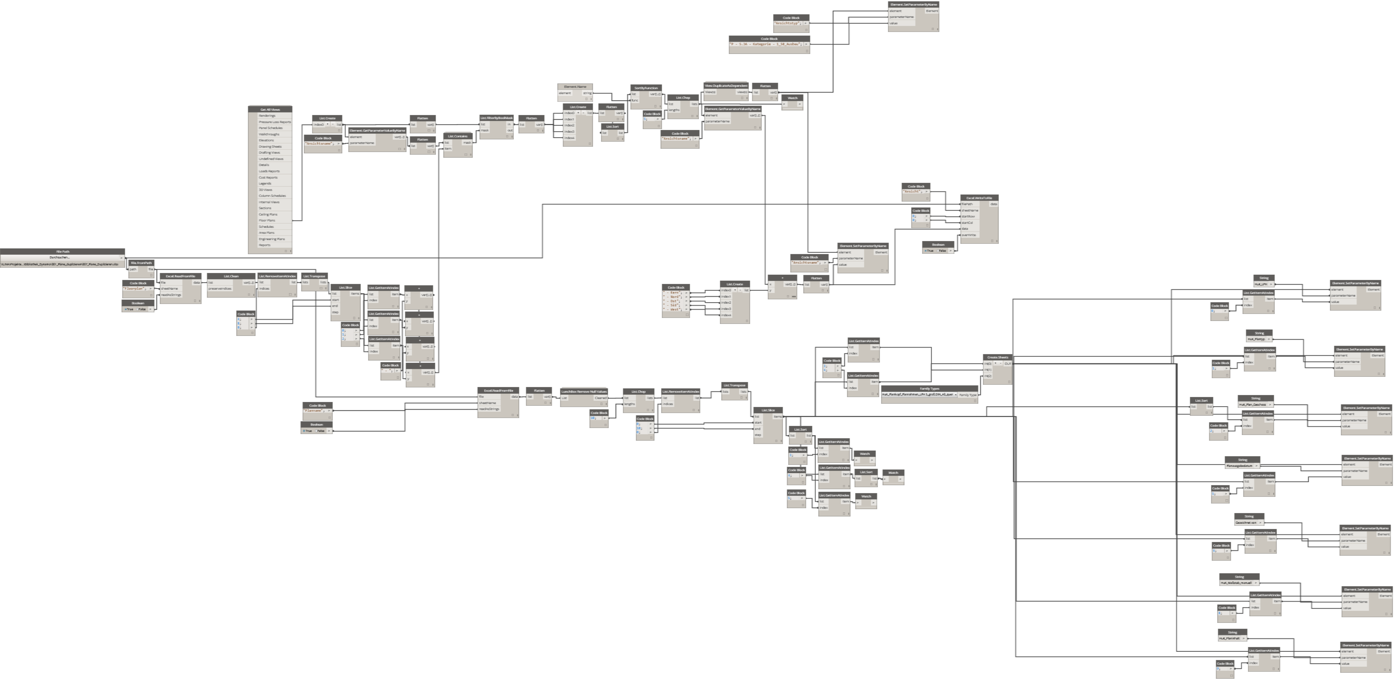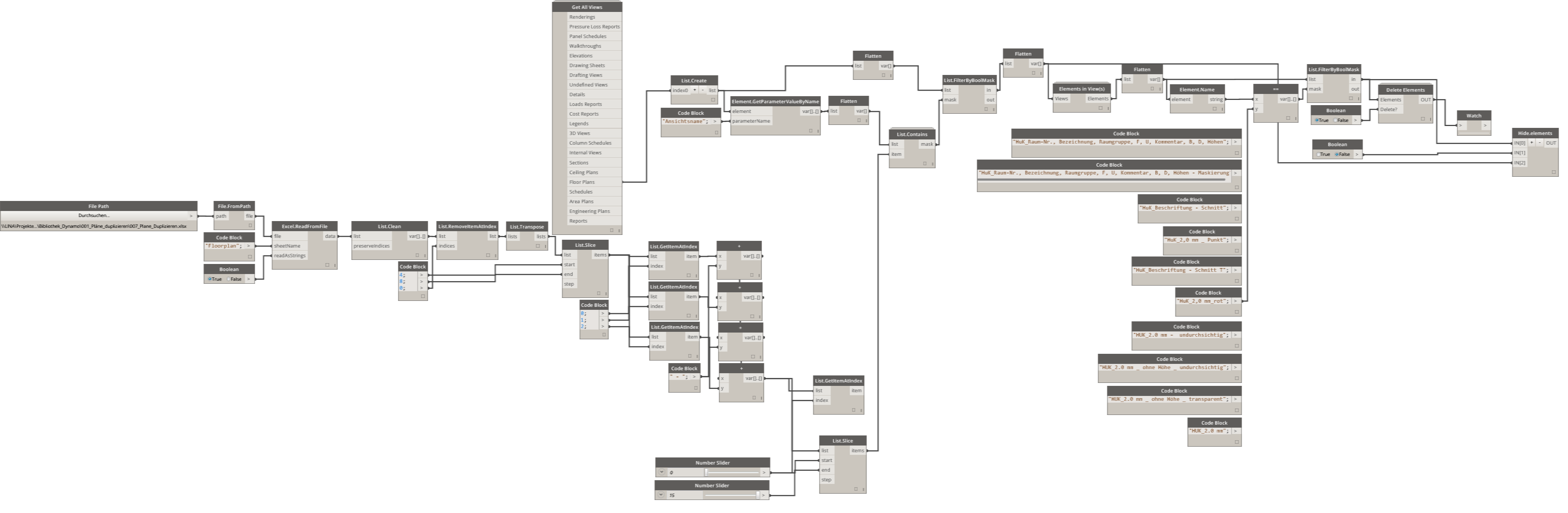 Die Erstellung sowie die Auswahl der Ansichten aus der Revit-Datei wurde mit Hilfe einer booleschen Abfrage durchgeführt. Die für diese Filter verwendeten Werte sind ebenfalls in der Excel-Datei enthalten, die auch die Parameterwerte für die Erstellung der neuen Ansichten / Pläne enthält. Als Parameternamen wurden gängige Bezeichnungen aus dem Büro benutzt, so dass die Nutzung des Skripts auch für die Kollegen, die mit Dynamo keine Erfahrung hatten, sehr benutzerfreundlich und intuitiv war.