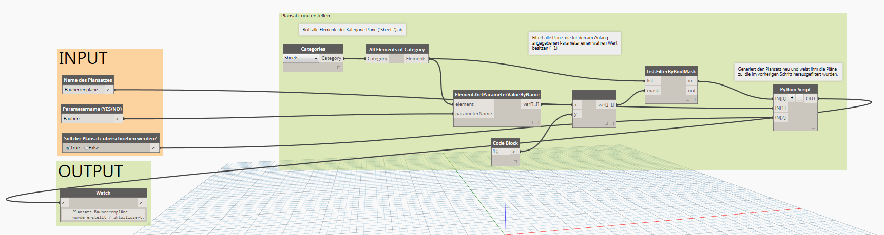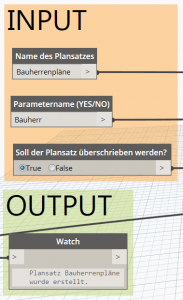 Sie müssen den Namen des gewünschten Plansatzes sowie den abzufragenden Parameter angeben (genaue Schreibweise beachten!) sowie durch die Auswahl die Boolsche Auswahl bestimmen, ob ein bereits vorhandener Plansatz überschrieben werden darf oder nicht. Sofern dieser Wert auf False, also nicht überschreiben, gesetzt ist und der angegebene Plansatz bereits vorhanden ist, erhalten Sie in dem OUTPUT Feld die entsprechende Fehlermeldung. Das komplette Script ist ausführlich kommentiert und leicht nachvollziehbar.