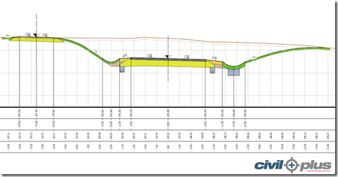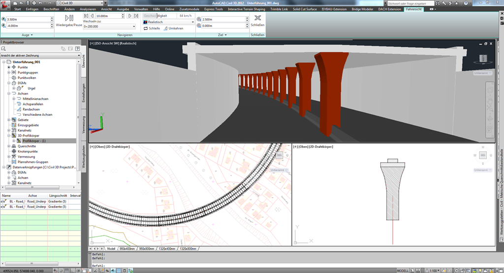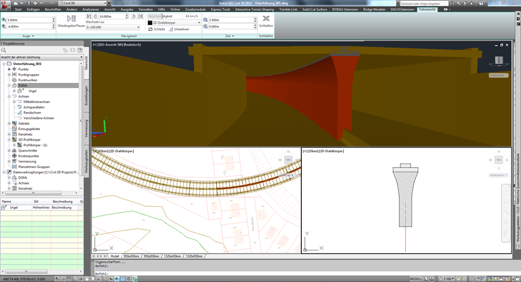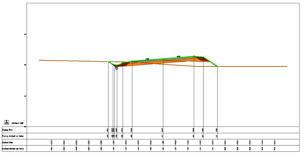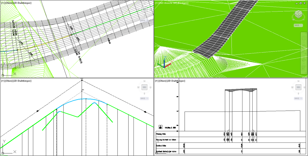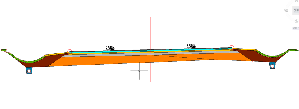 Die Breite der Fahrspur wird über Randachsen und die Höhe bzw. Tiefe der beiden Stege des Brückenoberbaus wird durch eine zweite Gradiente gesteuert. Die Querneigung wird über die Querneigungsliste an der Hauptachse berechnet.