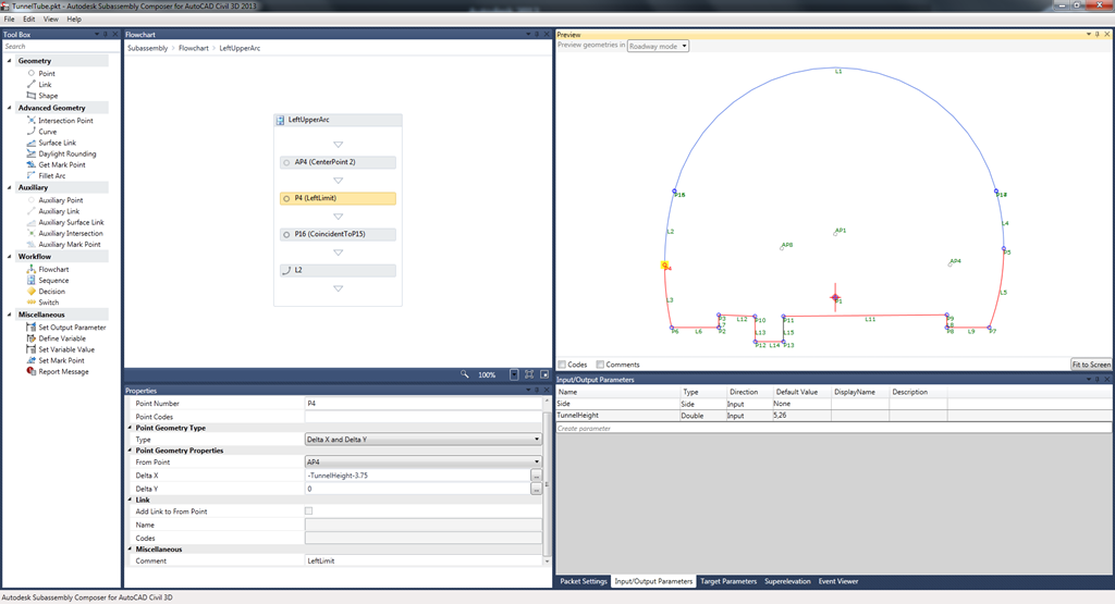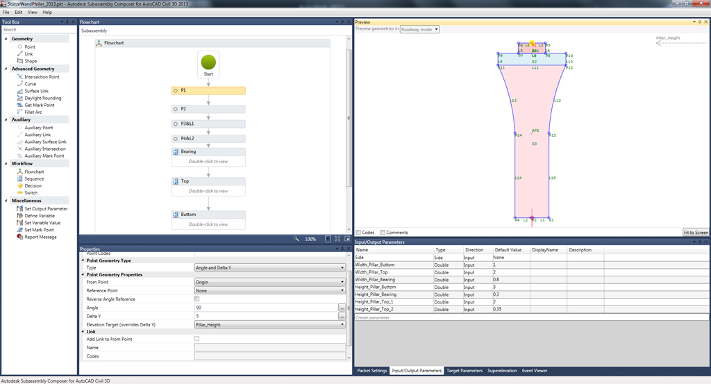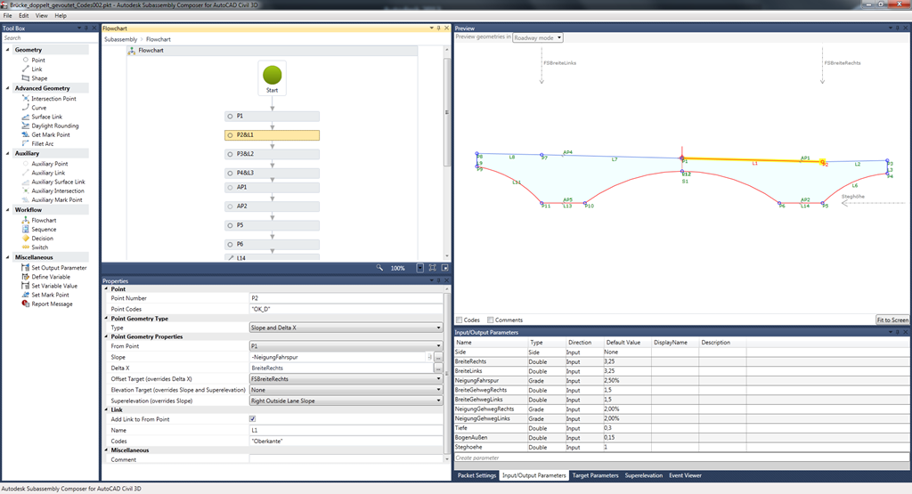 Der Autodesk Subassembly Composer für AutoCAD Civil 3D bietet eine graphische Benutzeroberfläche zum Erstellen und Ändern von komplexen Querschnittsbestandteilen ohne Programmierung.
