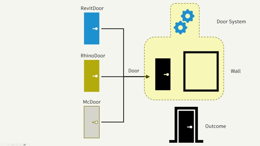 BIM software, for example Revit, authors doors or room data that is only natively fully consumed by itself. While Revit creates powerful outcomes by combining this data and behavior (The door contains a system that knows to cut holes in Walls) it also silos this information. If the same door is consumed by another application the system is not recognized.