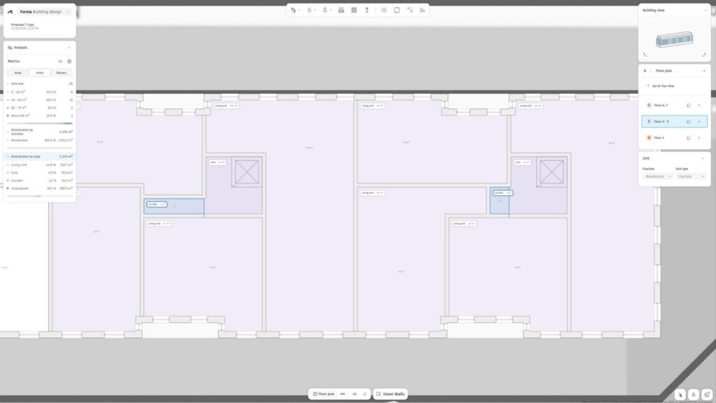- Spatial organization: Establishing circulation, core locations, unit types, and adjacencies