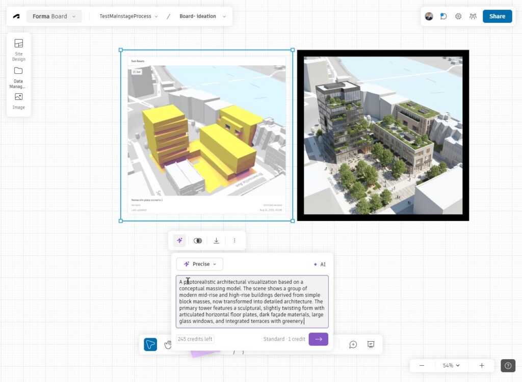 Teams can generate renderings of ideas from sketches and images directly in the board to explore atmosphere, materiality, and mood. Forma Board includes 250 renderings per month per seat.
