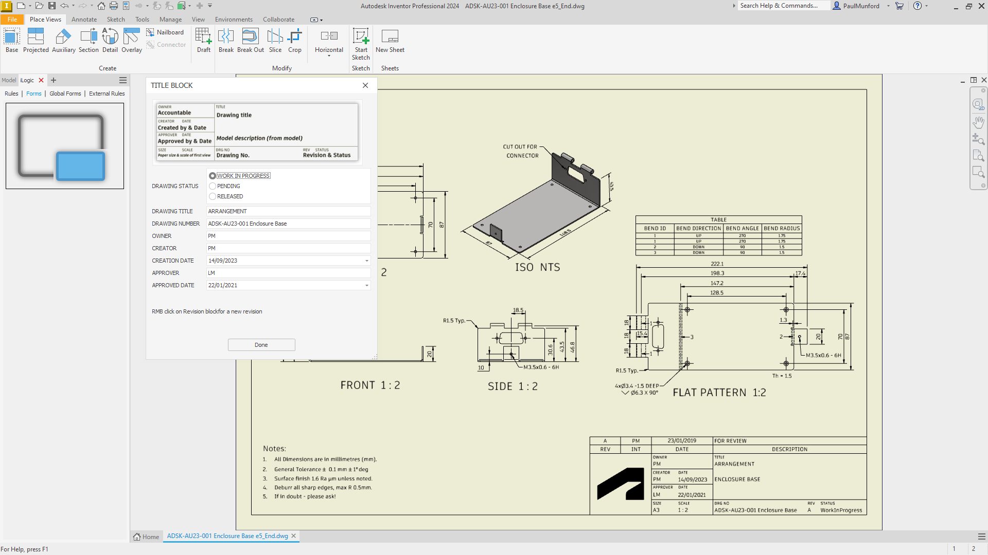 A screen capture of the Autodesk Inventor 3D CAD interface. an iLogic form is being used to change the values in a 2D technical drawings titleblock.