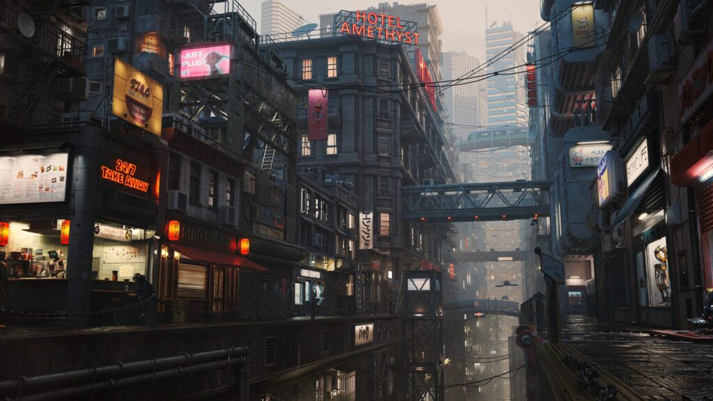 While the architecture is Brutalist influenced, Darko has added warmth to the extensive concrete through people and details, like colorful graffiti, neon signs, and other decor. He created a library of primary material types, including plastic, metal, and different concretes that artists can draw from. For further efficiency and high-quality results, Darko and the team also built custom tools in Maya.