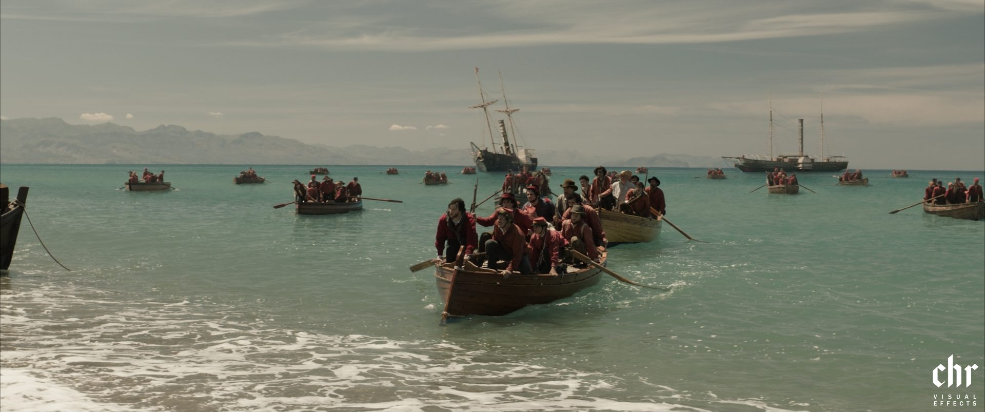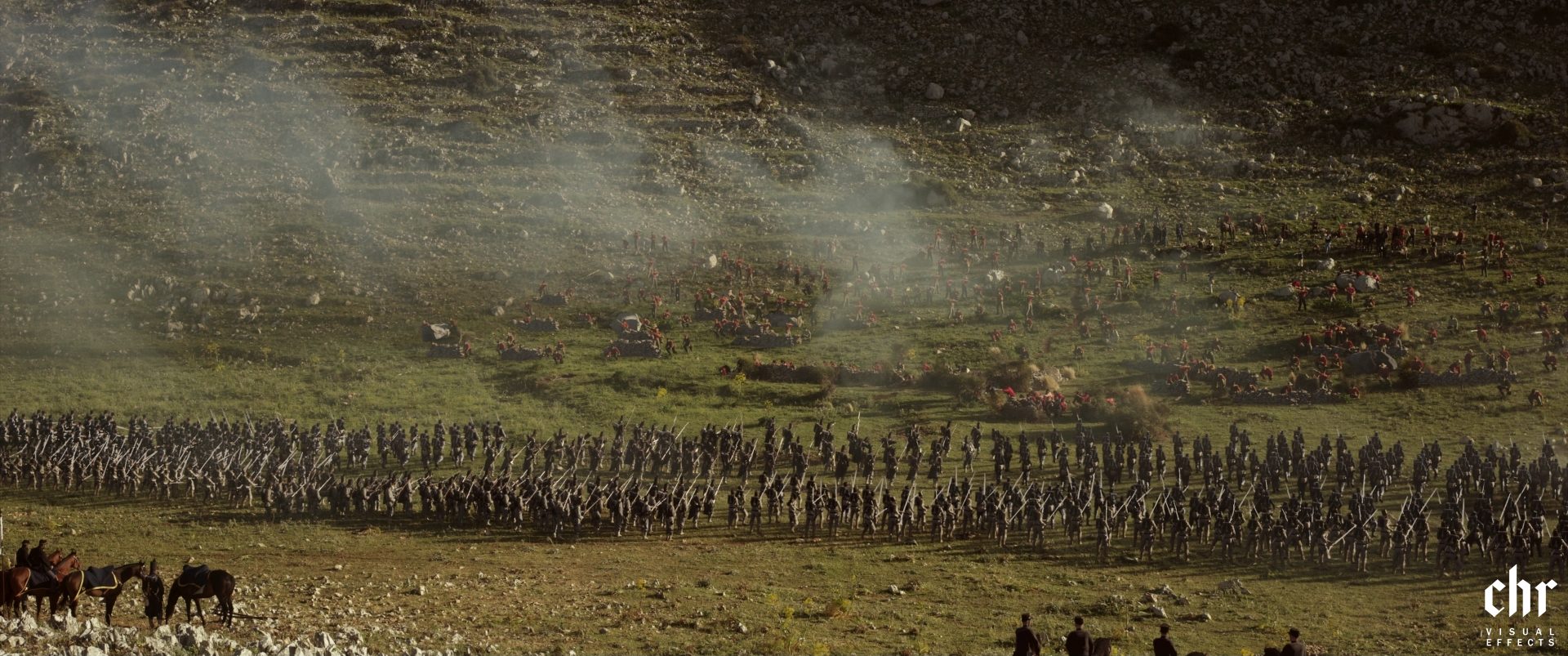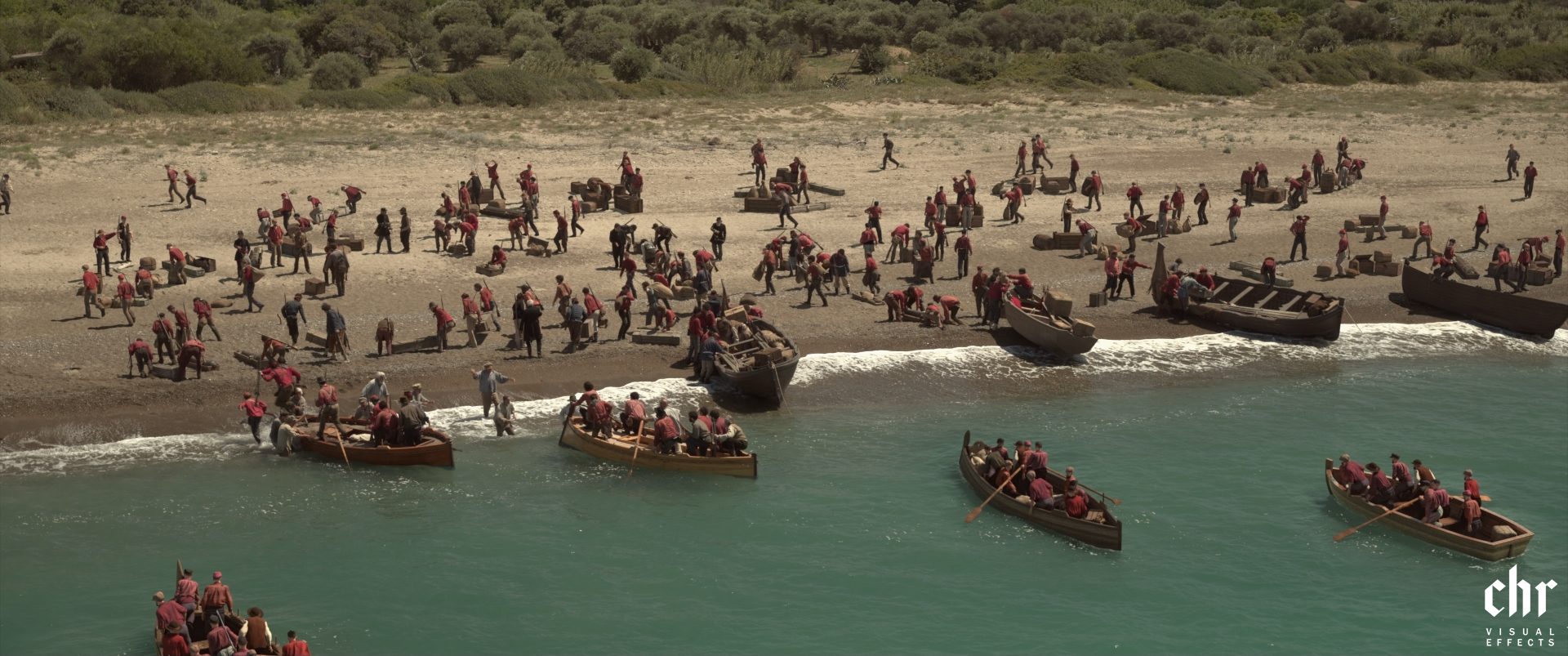 There were 44 shots of marching and battle scenes, both on land and at sea, containing a wide variety of animations performed by our 3D characters. Below is a scene with more than 30 different animations replicating the actions of the extras.