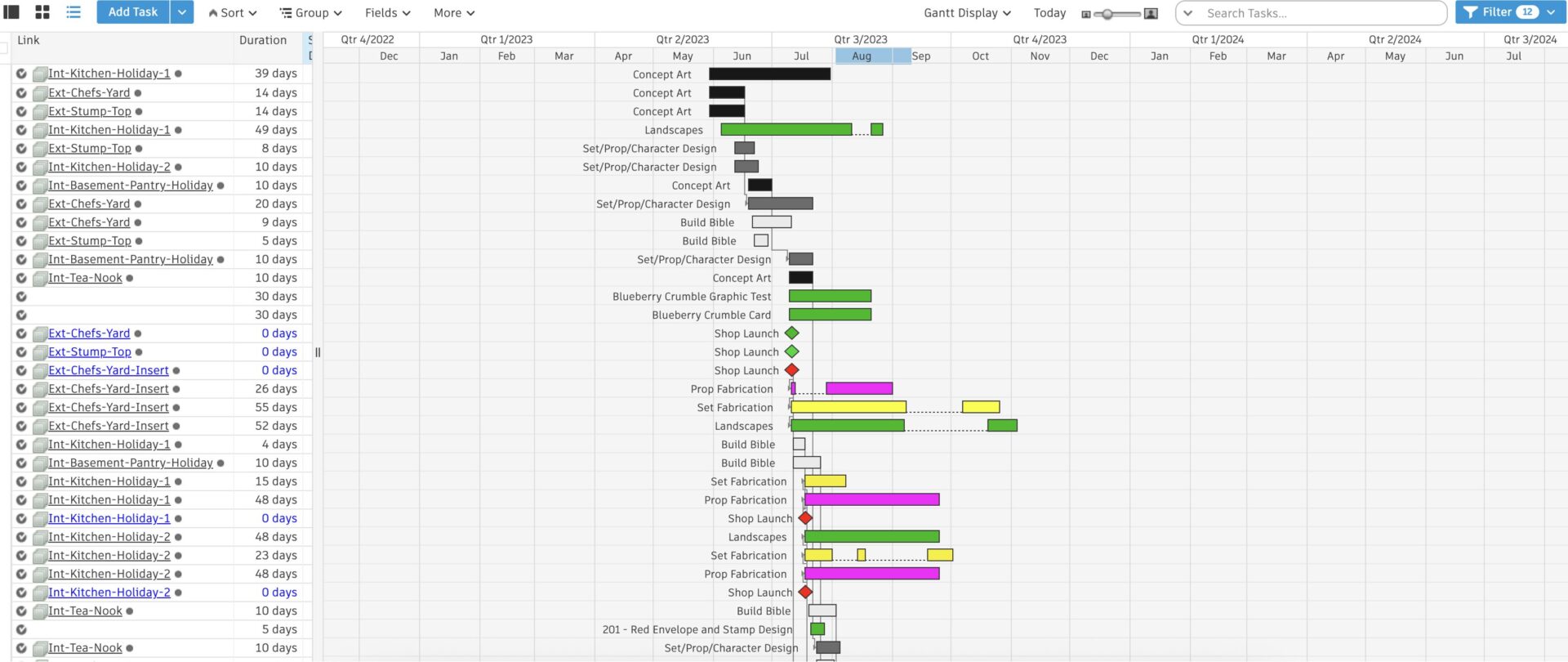 Schmerber then stamps those tasks onto all their different locations and puts it all together in the art department build schedule (07:41). The schedule will be hundreds of tasks long, but Flow Production Tracking allows her to sort them into separate and color-coded team-specific schedules. Then she can easily see and cater to the workloads on the set fab schedule, the model shop schedule, the scenic schedule, and the landscape schedule.