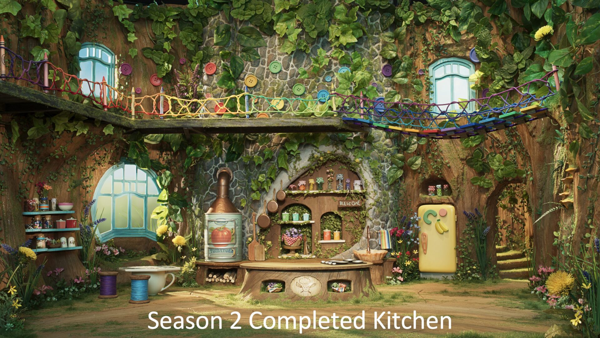 With all that in mind, they embarked on redesigning a number of environments, and Schmerber takes the viewers through them one by one. For the Interior Kitchen redesign (08:50-12:24), they considered the Original LA Kitchen (08:58) that was used in social media releases, and the Season 1 Kitchen (09:41). Their Season 2 Kitchen Design concept art (10:05) kept elements like rope work, stone work, and the shape of the kitchen island, while adding elements like a refrigerator and a more interesting kitchen wall background. You can see the Kitchen Wall Sculpt Review 1 and the Kitchen Wall Sculpt Review 2 to see the evolution of the design leading up to the colorful, playful, and fun Season 2 Completed Kitchen.