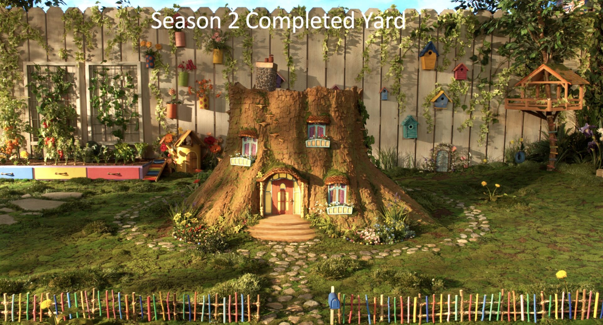 As Schmerber’s final case study, ShadowMachine redesigned the entire Exterior Chef’s Yard (14:50-18:01) “a really important environment in his world,” she says, “and we wanted to do it justice.” They were told to address, for example, the bark texture of Chef’s tree stump house and the flat yard topography from the Season 1 – Chef’s Yard. Schmerber shows stages of the yard’s design evolution leading to the Season 2 Yard Design concept art. She also reveals the set deck breakdowns, which divide the yard set into puzzle piece decks that can be taken out so that animators and camera setups can access every part of the set when needed. Finally, the Season 2 Completed Yard design creates an ornate backdrop for the opening credits of The Tiny Chef Show Season 2.
