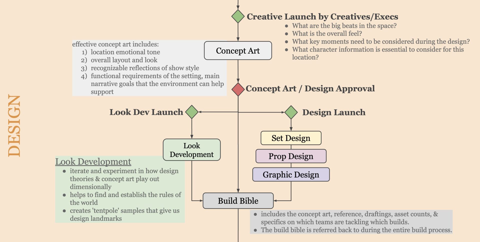 Next, the design process (02:20) launches by integrating the show’s locations, emotional tone, overall layout and look, style, and main narrative goals into the initial concept art. They then launch design teams for set, prop, and graphic design, as well as look development (lookdev). “Look development… helps iterate and experiment in how design theories and concept art play out dimensionally,” Schmerber says. They compile all of the above art and information into a “Build Bible,” which the fabricators and other artists refer to for accuracy through the entire process.