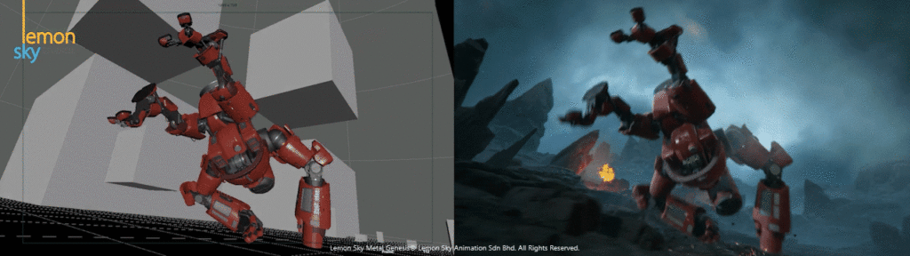 A: The Metal Genesis cinematic was produced entirely in-house by Lemon Sky Studios, pushing creative boundaries with bold new mech designs and high-intensity battle sequences. Alongside the visual storytelling, the project also served as an opportunity to explore and refine our production pipeline, specifically the integration between Maya and Unreal Engine.