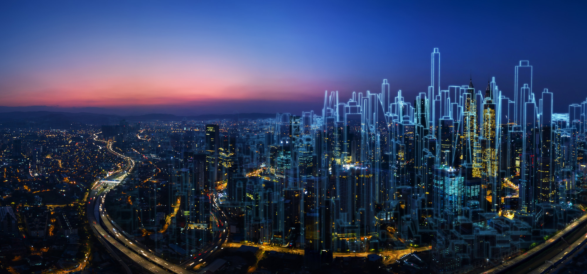 High-angle view of Kuala Lumpur skyline at night with wireframe overlay. 3 Super Novidades da Autodesk para projetos de Infraestrutura, e por que você deve estar de olho nelas