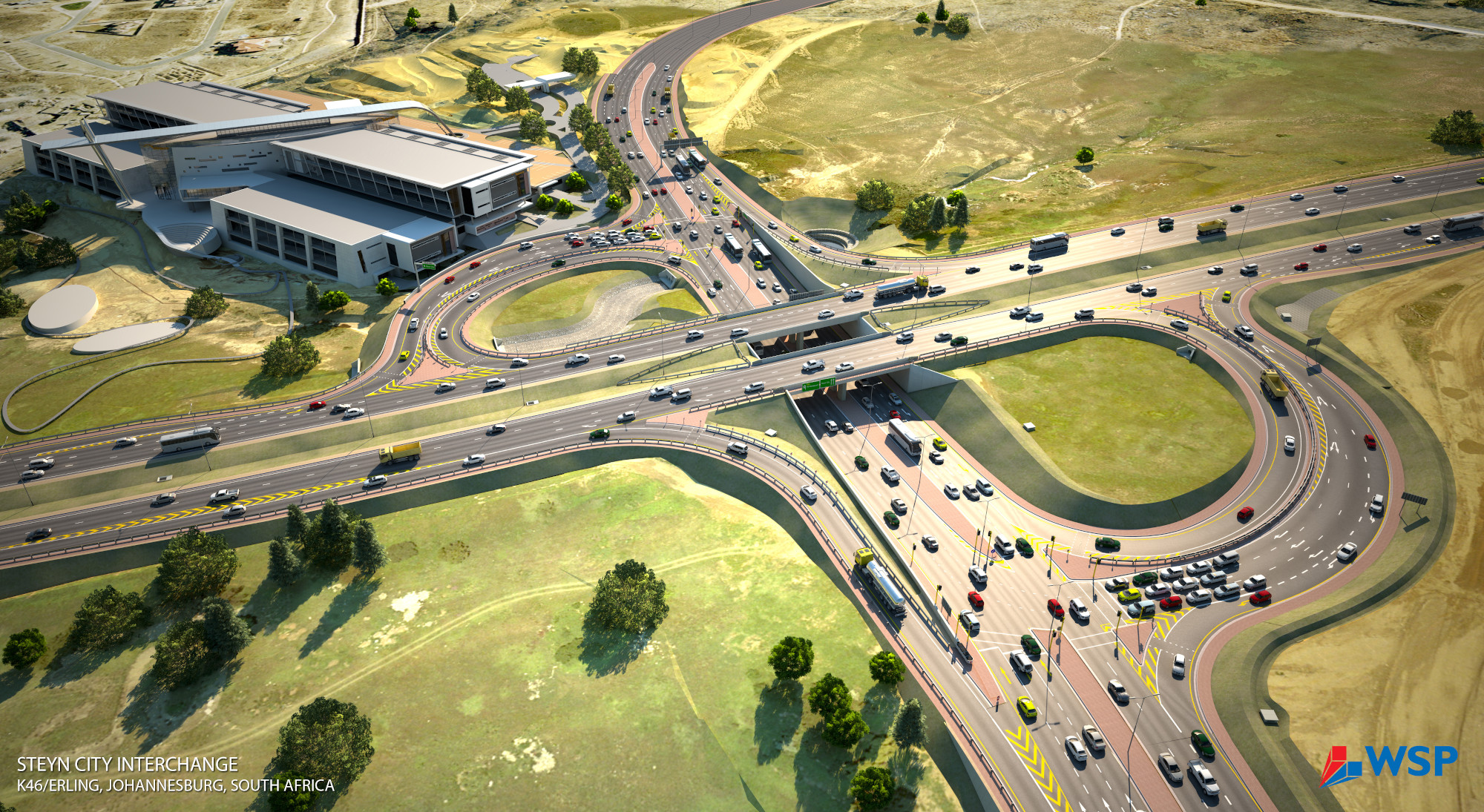 Rendering of the Steyn City K46 Erling Interchange, Johannesburg, South Africa. Rendering created in 3ds Max Design by WSP (AFRICA).
