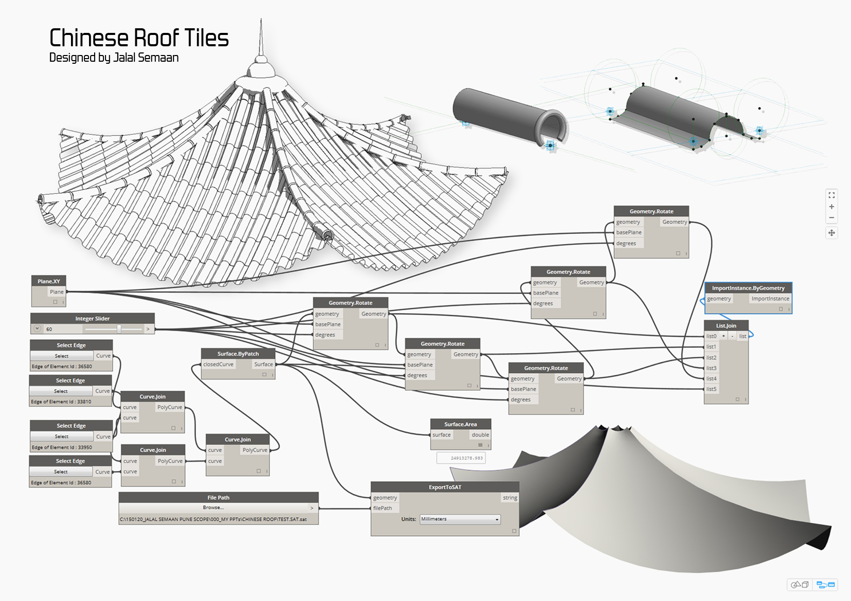 Telhado e telhas chinesas por meio de programação visual em Dynamo. Fonte: DynamoBIM.org, autoria de Jalal Semaan.