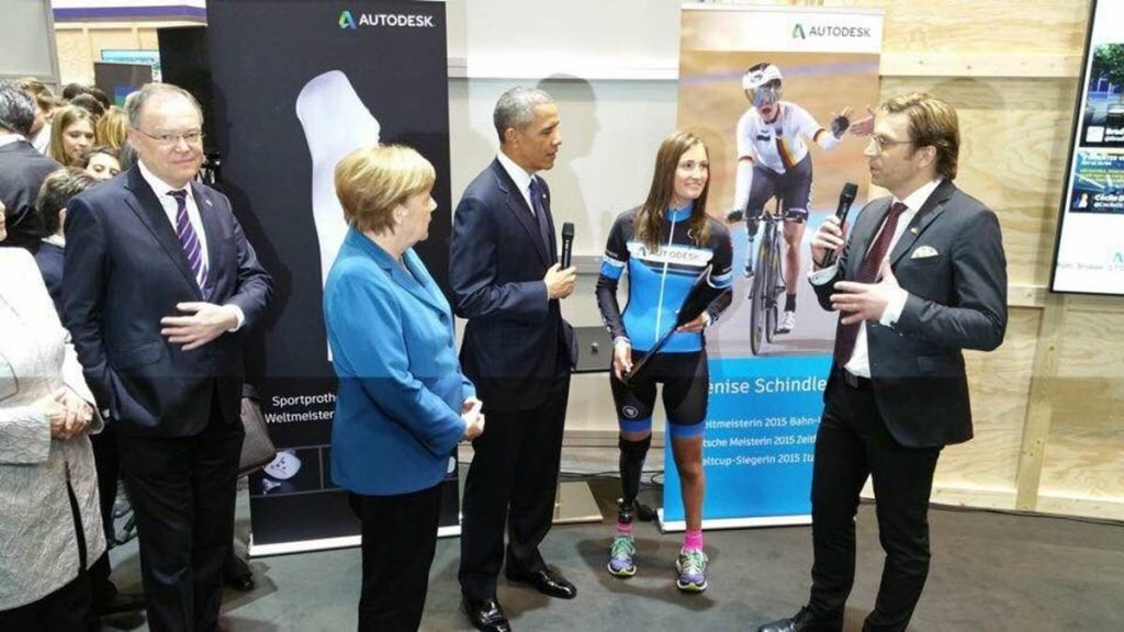 Denise Schindler zusammen mit Barack Obama und Angela Merkel | Autodesk und Denise Schindler präsentieren auf Hannover Messe die Prothese der Zukunft